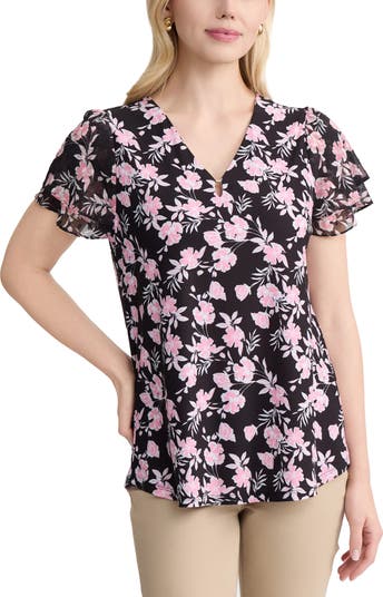 Simple details like fluttery chiffon sleeves and hardware-accented cutout add special touches to this top that elevates your everyday look with a polished finish.