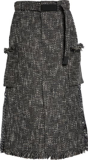 A master of studies in contrast, Chitose Abe employs her technical wizardry to create this tweed skirt combined with softly pleated chiffon printed with a complementary texture in back for an unexpected twist. Fluffy fringe at the pockets and hem softens the look, while a buckled belt trails long in front.