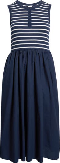 A soft knit henley bodice brings casual ease to this sleeveless linen-blend midi dress balanced by a sweeping poplin skirt for crisp contrast. A shirred waist defines the silhouette and adds comfortable shape through the transition.