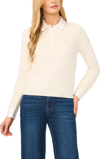 Striped woven trim defines the collar, placket and cuffs of a knit henley that has you looking posh on casual or elevated outings.