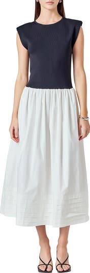 Crisp pleats volumize the hem of an easygoing mixed-media dress designed with a soft knit bodice and crisp woven skirt.