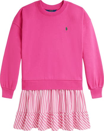 Soft loopback cotton forms a sweatshirt-style bodice that transitions into a crisp striped skirt on this comfy dress that telegraphs classic preppy style.