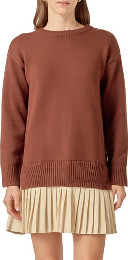 Achieve a two-piece look with one-and-done ease when you choose a casual mini that reads like a cotton sweater paired with a pleated cotton skirt.