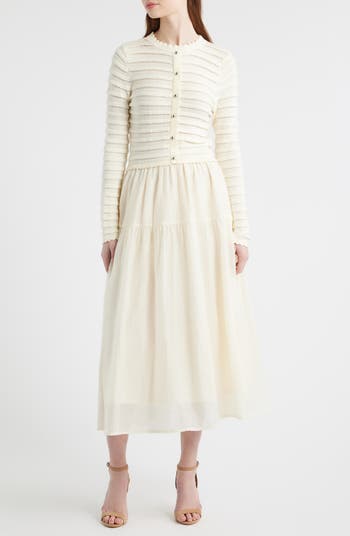 Mixed Media Long Sleeve Scallop Stitch Tiered Midi Dress