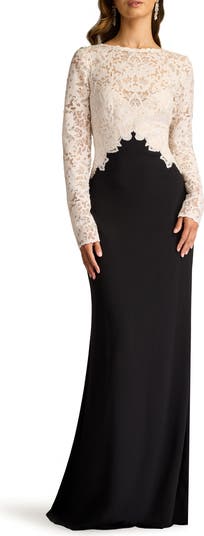 An exquisite lace bodice tops a puddling black skirt in a timelessly elegant gown that will inspire toasts.