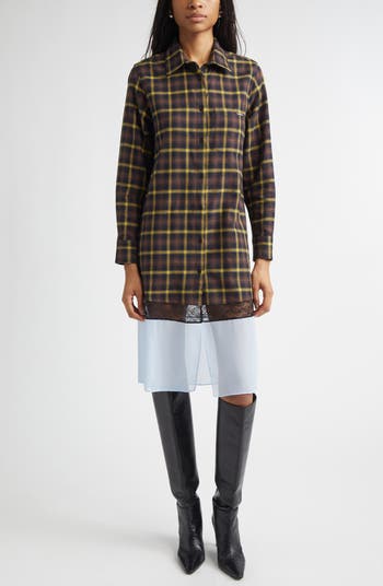 Contemporary eclecticism defines this mixed-media shirtdress that unexpectedly pairs plaid flannel with floral lace and airy chiffon.