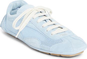 A pastel hue sweetens the contemporary energy of a T-toe sneaker that's opened by unexpected netting and framed with velvety suede.