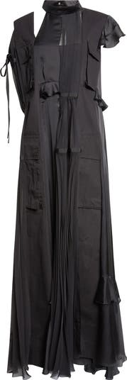 A master of contrarian textures, Chitose Abe employs her technical wizardry to create this runway-featured maxi dress that combines sharply pleated chiffon and glossy satin ruffles into one bold statement.