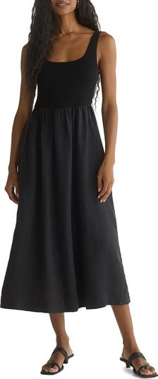 A linen skirt gives a crisp silhouette to this fit-and-flare midi dress topped by a stretchy, contrasting bodice.