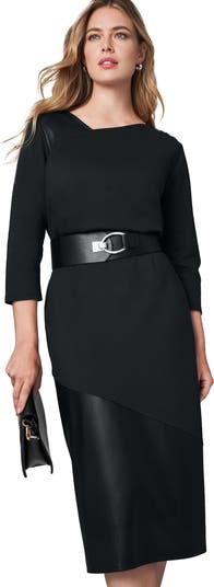 For feel-good feminine style that looks and feels elevated, reach for the Jessica London women's plus size Mixed Media Midi Skirt. This wardrobe must-have features a knit ponte top panel and faux leather skirt. Add our Mixed Media Top for easy outfitting that always looks polished.