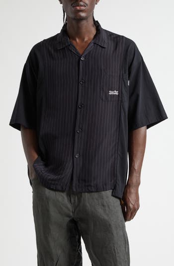 Mixed Media Pinstripe Short Sleeve Button-Up Shirt
