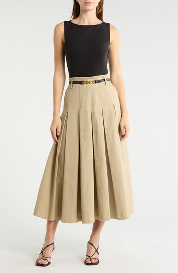 Achieve a two-piece look with polished, one-and-done ease when you choose a dress designed to read like a ribbed shell paired with a khaki skirt shaped with released pleats. An optional slim belt pulls the whole look together.