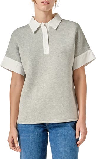 Heathered scuba fabric and woven trim give this boxy top a retro look with a modern mixed-media twist.