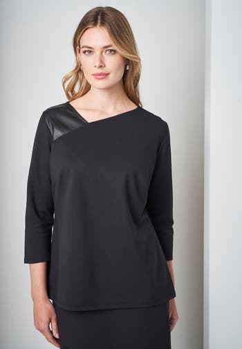 This Jessica London women's plus size Mixed Media Ponte Faux Leather Top features faux leather trim at the neckline and shoulder. It’s a special piece you'll save for those times when you want to look effortlessly chic. Pair it with our Ponte Leggings for head-to-toe sophistication.