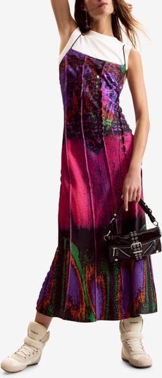 90's revival meets art-school edge in this sleeveless midi dress that reads like an electric paint-splatter slip layered over a contrast T-shirt for straight-from-the-era attitude.