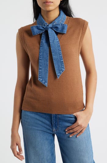 A removable cotton denim bow tops this sleeveless mixed-media sweater bringing playful contrast to its softly knit bodice.