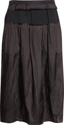 A mixed-media design with inside-out construction identifies this skirt as a Margiela piece, with unfinished raw edges and a line of white basting stitches affixing the silky georgette skirt to the fitted wool yoke. At the back, the Maison’s white stitch moniker offers a quiet signature.
