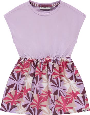 This mixed media dress features a solid lavender t-shirt style bodice and a multi-colored palm tree themed skirt.