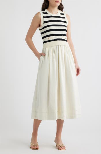 Achieve a two-piece look with one-and-done ease when you choose a sleeveless dress that reads like a striped sweater vest paired with a pocket-popped full skirt.
