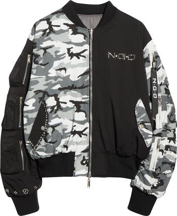 Rhinestone and metal studs trace the brand logo at the chest and trim the pocket flaps and cuffs of this mixed-media bomber/flight jacket featuring camo ripstop and a branded ripcord clipped to one of the six zip pockets stacked onto the sleeves.