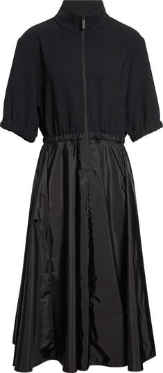 Toggle-adjustable drawcords at the cuffs and waist add the function to the fashionable look of this midi shirtdress featuring a stand-collar bodice made from fluid crepe cady and a softly pleated nylon skirt.