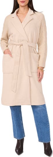 Cable-stitched raglan sleeves frame a cozy longline cardigan designed with a woven front for contrast.