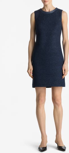 A simple collar of contrasting texture hews to the overall hue of this simply elegant sleeveless sheath dress done in metallic-flecked tweed.