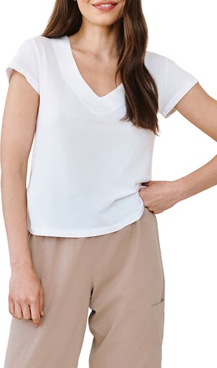 With knit jersey through the body and woven trim at the neckline and cuffs, this V-neck T-shirt offers amazing softness and a cool mixed-media look.
