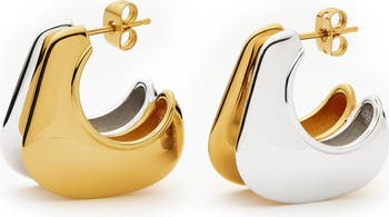 Icy rhodium and warm 18-karat gold plate these dimensional hoop earrings that double down on shine.