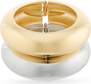 Mixing metals is topping the trend report, and this set of softly sculptural statement bangles is a winning way to wear the look.