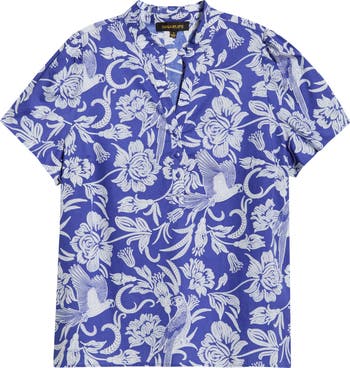 A closer look reveals both flora and fauna patterning a vibrant shirt cut from cool cotton.
