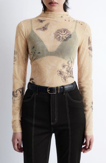Butterflies, flowers and celestial vibes cover this layerable, sheer-mesh top framed by long sleeves and a chic funnel neckline.