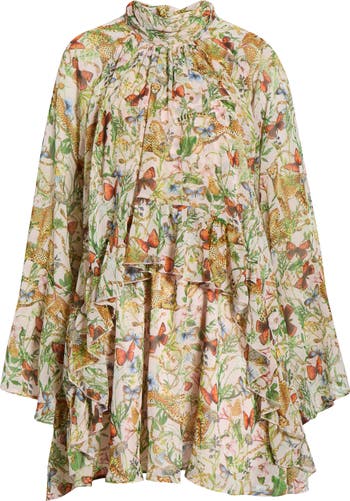 Flora and fauna are artfully arranged across a graceful minidress designed with a high neck and belled sleeves.
