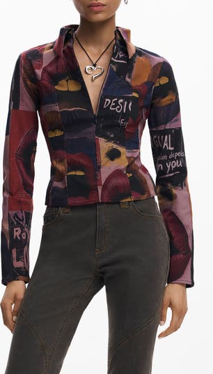 A captivating collection of images animates a curve-skimming shirt closed with a clean zipper.