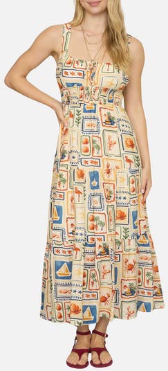 A smocked waist shapes the silhouette of this lightweight sleeveless maxi covered in a beach-inspired print and finished with a drapey skirt.