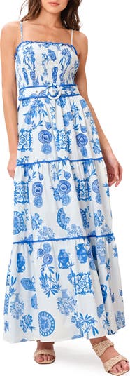 Shades of sea and sky animate a vacation-ready cotton maxi dress offered in a lively print and cinched with a matched belt.