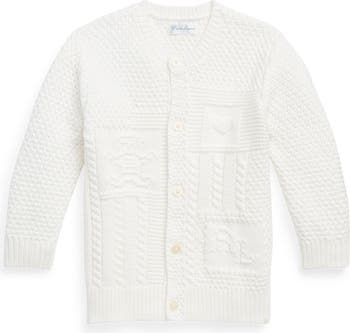 Mixed stitches and a motif of bears, hearts and alphabet letters enhance the sweet look of a cardigan knit from pure cotton to be soft against baby's skin.