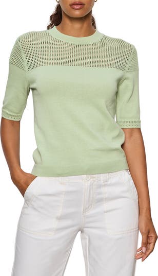 Airy open stitching on the yoke and cuffs contrasts with the fine-gauge knit of a short-sleeve cotton sweater you'll love for the new season.