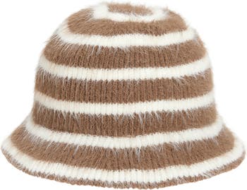 Fuzzy yarn enhances the cozy vibe of this on-trend bucket hat further enhanched by a bold stripe pattern for a look that will charm any look you wear with it.