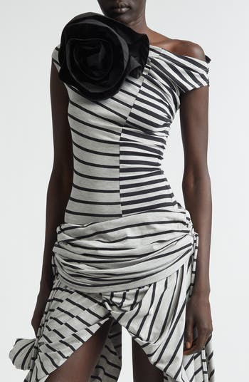 Mixed cotton-and-modal jersey stripes are spliced at the side of this asymmetric top cut with differing sleeves and decorated with an oversized taffeta corsage bloom. Wholly owned by Comme des Garçons, this brand is part of Dover Street Market Paris, created with the goal of bringing emerging brands to market.