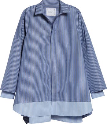 Chitose Abe showcases her hybridized wizardry in this oversized Japanese-poplin shirt, where competing striped patterns cheat the look of two layered shirts without the bulk.