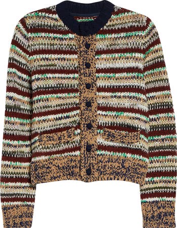 A mixed assortment of marled and textured yarns creates artful stripes on this chunky cardigan fastened with crochet-covered buttons.