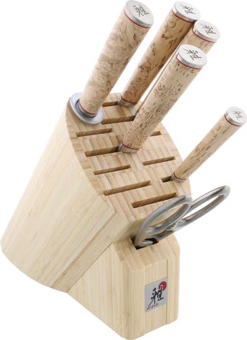 How it's made: The blade core made of MicroCarbide MC63 powder steel is surrounded by 100 layers of two different types of steel with different levels of hardness. The CRYODUR® blade is hardened using a specially developed ice-hardening process at -196°C that guarantees extreme hardness of 63 Rockwell and a lasting sharp blade. A special blade treatment alters the surface structure of each layer, resulting in the individual floral damask pattern. A traditional Japanese Honbazuke honing gives every blade its incomparable sharpness. The 19-degree symmetrical blade is the result of V-edge honing.
