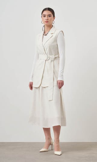 LINEN TEXTURED BUCKLED ECRU VEST, Crafted from premium %53 Polyester %10 Linen %37 Viscon fabric. This vest boasts a luxurious texture and lightweight feel, perfect for all-day comfort.