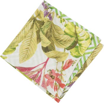 - Each napkin measures 20" x 20". A botanical canopy of vibrant pink and green leaves brightens any room This item includes 6 napkins which feature turned seams. Each napkin measures 20 x 20 inches, similar to the size of a bandana. The coordinating placemats and table runner are available separately. Crafted of 100-percent cotton