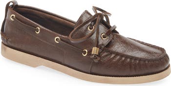 Golden Goose puts their signature spin on a moc-toe boat shoe made of softly scuffed leather with gleaming, golden hardware.
