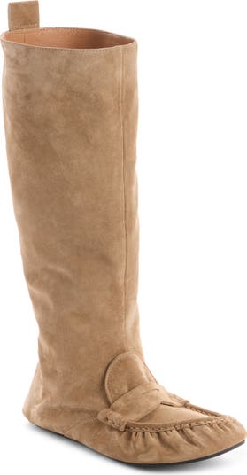 A gathered moc-stitched toe and penny keeper strap bring loafer-inspired style to this slouchy boot done in supple calfskin suede.