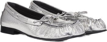 Women's Italian metallic calfskin leather moccasin with distressed finish and leather sole