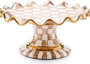 Hand-painted color-dragged checks further the retro vibes of this handmade fluted cake stand that showcases your favorite treats and delicacies.