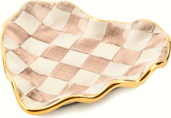 Keep your favorite trinkets on this heart-shaped plate that stands out on any surface with its fluted rim and eye-catching Mocha Check pattern.